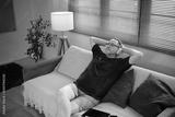 Relaxed older adult laying back on a sofa, listening to music with headphones