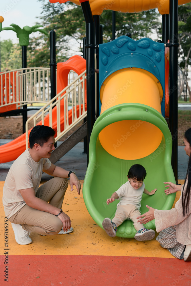 Happy parents watch and cheer as their toddler slides down a colorful slide