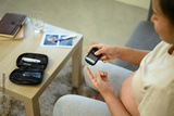 Pregnant woman measuring blood sugar levels with digital device, pregnancy health management