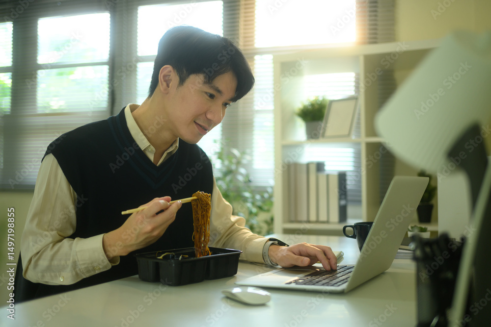 Smiling man eating instant noodles while working at his desk in a cozy, sunlit home office