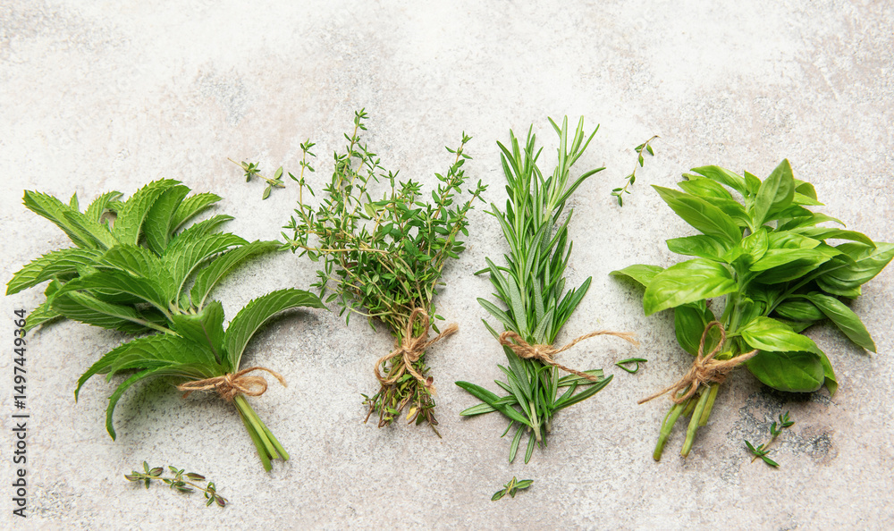 Freshly picked herbs tied in bunches on a textured surface