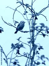 Wilson's Warbler, male sitting in alder tree, sideview, light blue sky background.