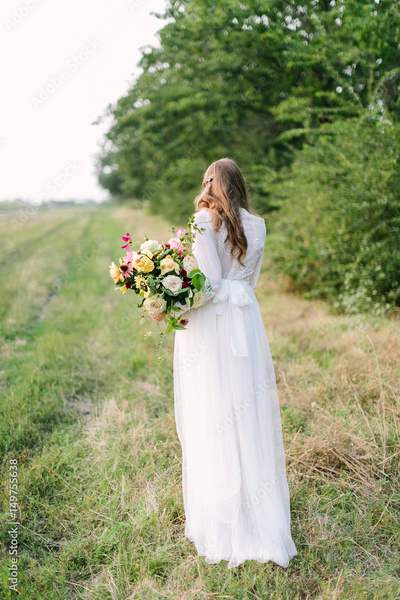 bouquet, people, flower holidays , gift and floral arrangement concept - beautiful female in a fashionable white dress posing with her back with bouquet of fresh flowers on background of trees