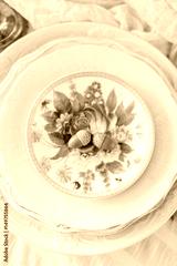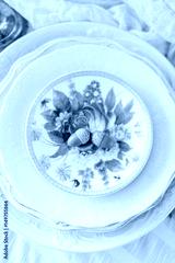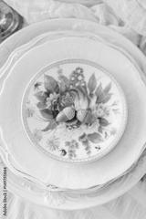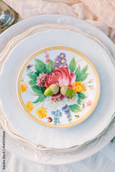 picnic, food, holiday concept - vertical stack of various holiday clean plates white and light shades, oak sprig with two acorns on the top plate is decorated with beautiful colorful flowers