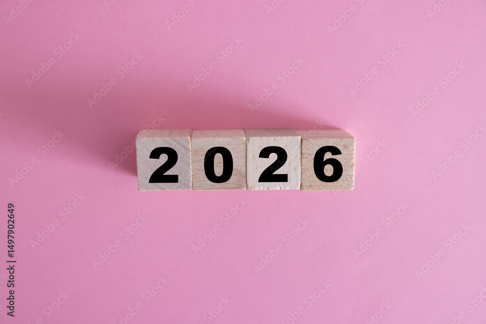 2026 on natural wooden cube highlighted by the sun, Concept to welcome the New Year 2026