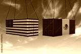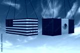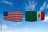 The concept of USA and Mexico export-import, container transporting and delivery of goods.The transporting container with the national flag of USA and Mexico, view front. Competition between countries