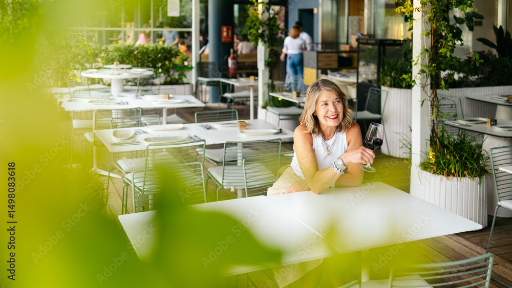 Smiling senior woman holding a glass of red wine while sitting at a table in an outdoor restaurant