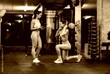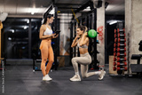 Strong muscular sportswoman in shape doing lunges with weight bag on shoulders at gym with her personal trainer.