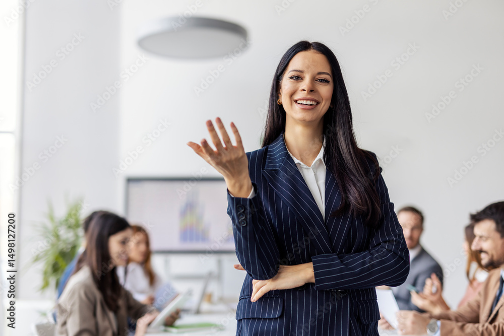 Portrait of manager sitting at conference table with her leadership team and smiling at camera during meeting.