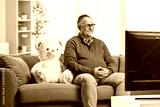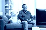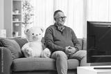Mature man with a teddy bear sitting on a sofa and watching tv