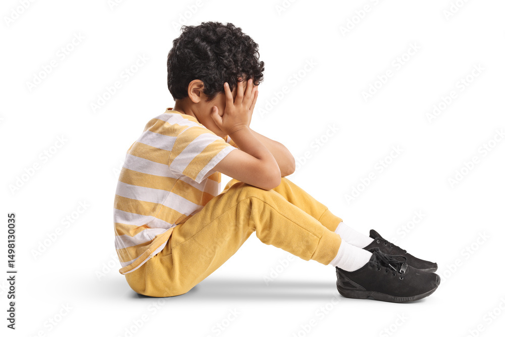 Lonely little boy sitting and holding head