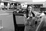 Young happy woman standing near her car, smiling and using cellphone, holding coffee cup, making stop at gas station during big road trip