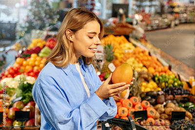 Woman enjoying the scent of ripe mango at fruit market