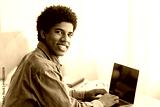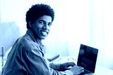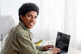 Young happy teenage guy using laptop for remote studies at home, mockup for design on screen. Positive youth attending webinar or online class, participating in conference during coronavirus isolation