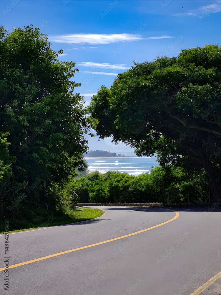 Coastal Road Through the Trees: A scenic coastal road winds its way through lush green trees, offering a glimpse of the serene blue ocean. Capturing the natural beauty of a drive with vibrant trees.