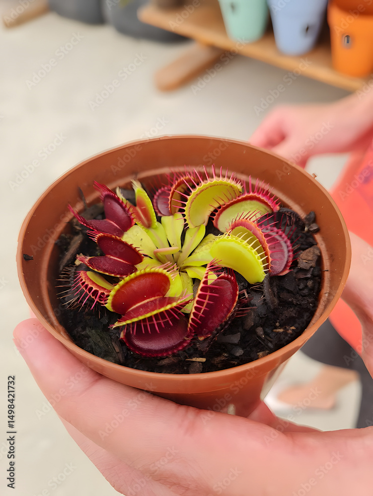 Venus Flytrap in Hand: A close-up perspective showcases the intricate beauty of a Venus flytrap, its vibrant traps elegantly displayed in a decorative pot. The image.