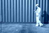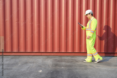 Engineer or worker walking forward and working on tablet in containers warehouse storage