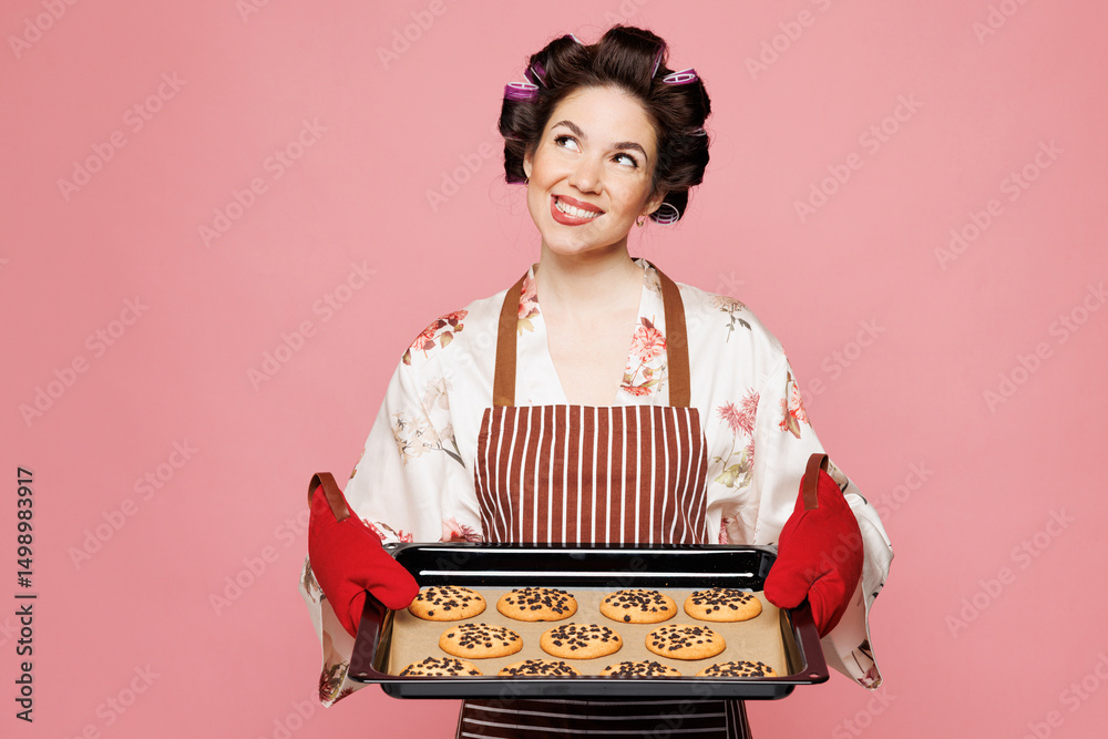 Young housewife housekeeper chef cook baker woman wear brown apron hold in hand sweet chocolate cookies look aside isolated on pastel light pink color background studio portrait. Cooking food concept.