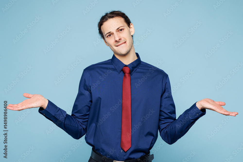 Young sad rich employee business man corporate lawyer he wear classic formal shirt red tie work in office spread hands do oops gesture isolated on plain pastel light blue background studio portrait.
