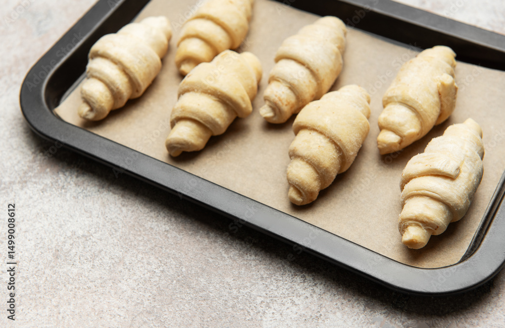 Raw croissants resting on baking sheet awaiting oven's warmth