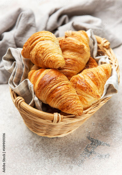 Golden brown croissants sit in a wicker basket, ready to be enjoyed