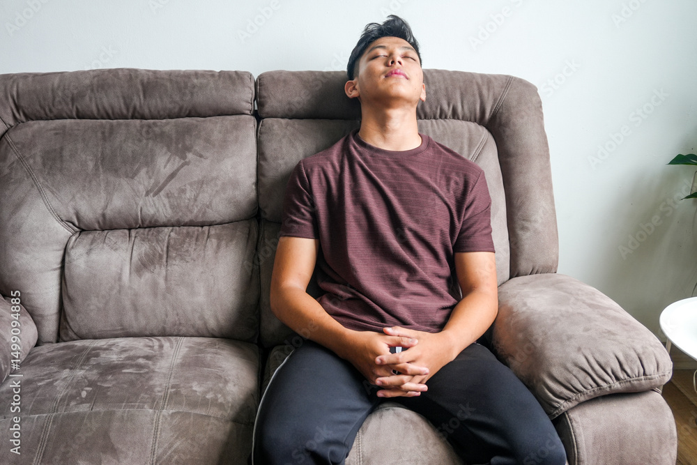 Young Calm Man Sit on Comfortable Sofa, Breathing Fresh Air and Enjoy Peace of Mind at Home