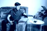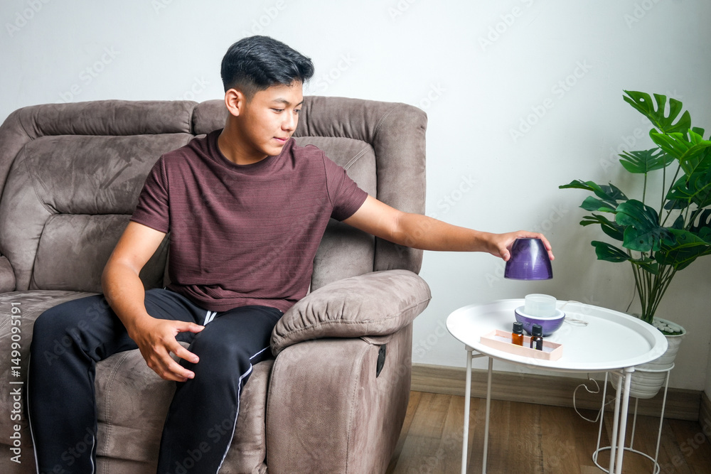Young Male Using Purifier in Room. Air Cleaning and Humidifying Device for House.
