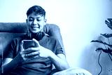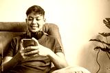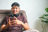 Happy Asian Man Wearing Headphone Listening Music Using Phone While Sitting on Couch at Home