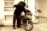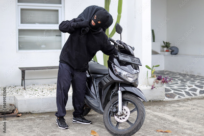 Motorcycle Thief in Mask Looking Around Before Making a Move in Apartment Lot.