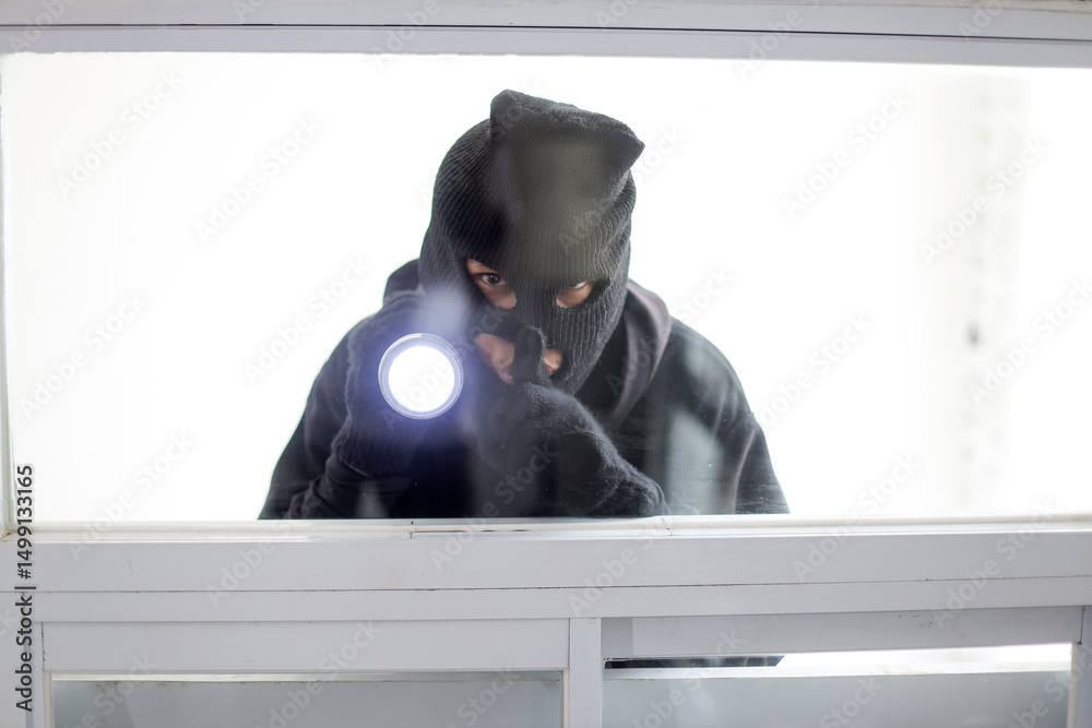Villain with Black Hat Sneaking into House Through Open Glass Door, Searching with Flashlight