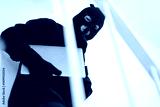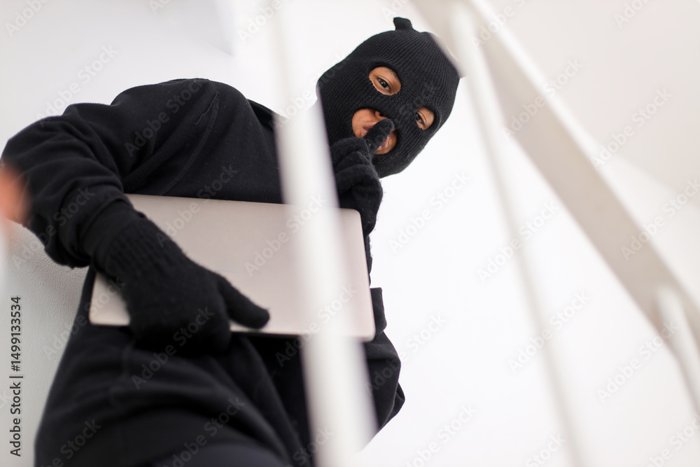 Criminal Wearing Hood and Mask Stealing Expensive Laptop from Someone's House.