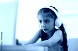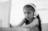 Asian kid or a girl with headphones looking curiously at laptop on white table while sitting on sofa