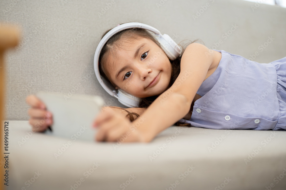 Asian kid or a girl wearing white headphones holding phone while lying facing camera on fabric sofa.