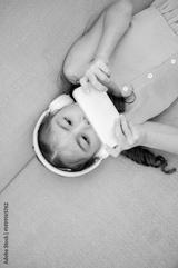 Asian kid or a girl wearing white headphones holding smartphone in both hands while lying on sofa