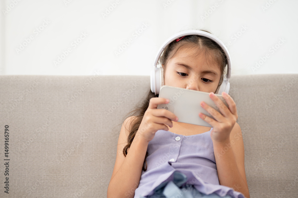 Asian kid or girl with white headphones holding smartphone and looking closely while sitting on sofa