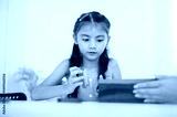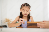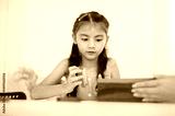 Asian kid or little girl in purple shirt is keeping wooden blocks in a jenga box after done playing.