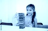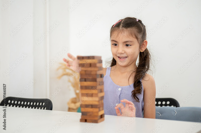 Asian kid or a little girl in purple shirt smiling while building a jenga tower on white table.