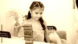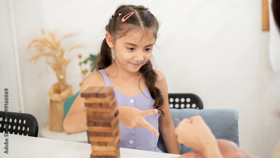 Asian kid or a little girl playing a rock paper scissors with parent while building a jenga tower.