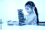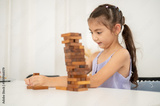 Asian kid or a girl in purple shirt playing jenga or a tower building game on her own at white table