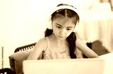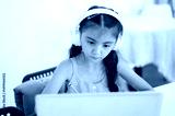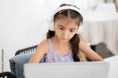 Asian kid or girl with headphone looking at laptop and writing with pencil sitting at table in house