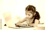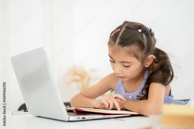 Asian kid girl reading or looking at an open notebook over a laptop while sitting at white table in house.