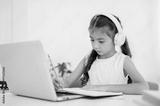 Asian girl kid wearing headphone writing on notebook while sitting with laptop on white table