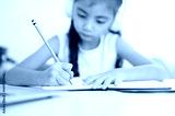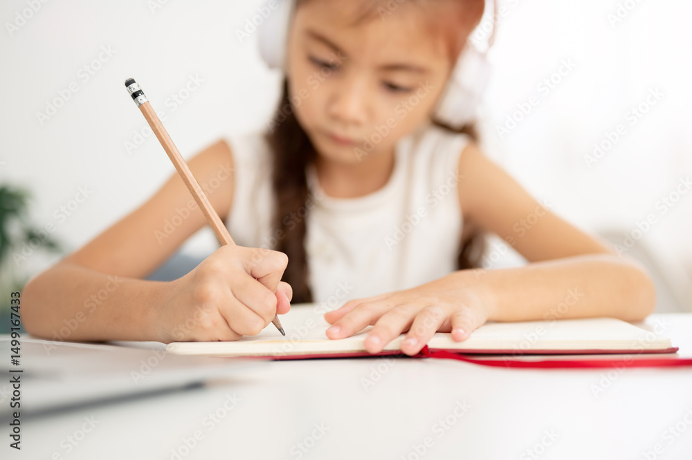 Close up of asian girl kid with headphones writing in notebook with a pencil while sitting at table.