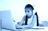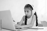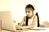 Asian girl kid wearing headphones looking and typing on laptop while sitting at white table in house