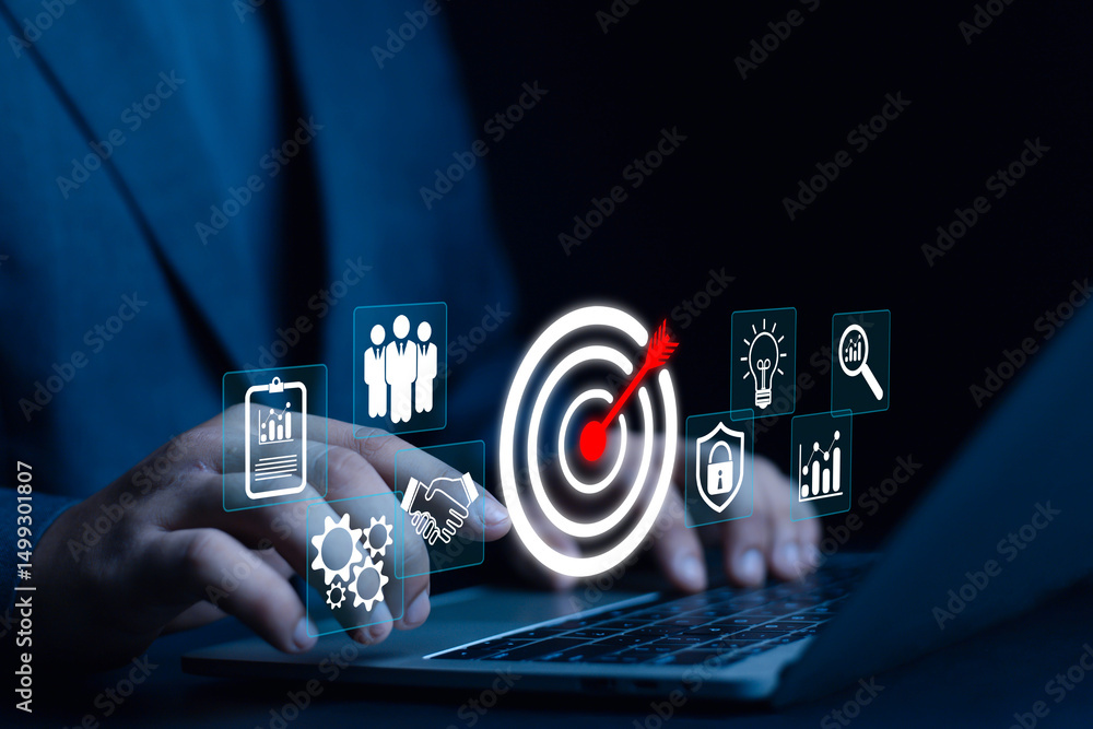 Businessman showing virtual target icon for business purpose, strategic planning for business growth and target customer group. Set business objectives goals, value, growth.