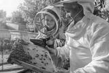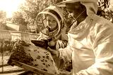 Experienced beekeeper grandfather teaches his grandson caring for bees. Apiculture. The transfer of experience.