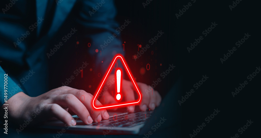 System hacked warning alert on laptop. error 404 alerts on a laptop, caution of spam in website digital Cyber attack on computer network, Virus, Spyware, Malware or Malicious software. Cyber sec