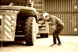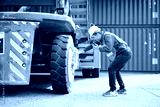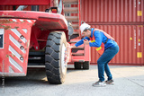 Worker or Engineer using walkie talkie and checking loaded container handler at containers warehouse storage