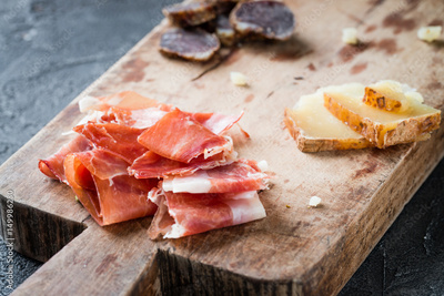 Platter with Spanish ham jamon serrano or Italian prosciutto crudo, homemade dried meat salami, sliced Italian hard cheese pecorino toscano, on old wooden board