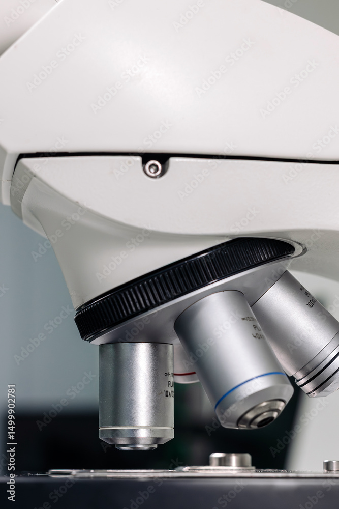 Close-up of scientific microscope with glass, analyzing data in lab, research for vaccine production. Concept of biological sciences and virology.